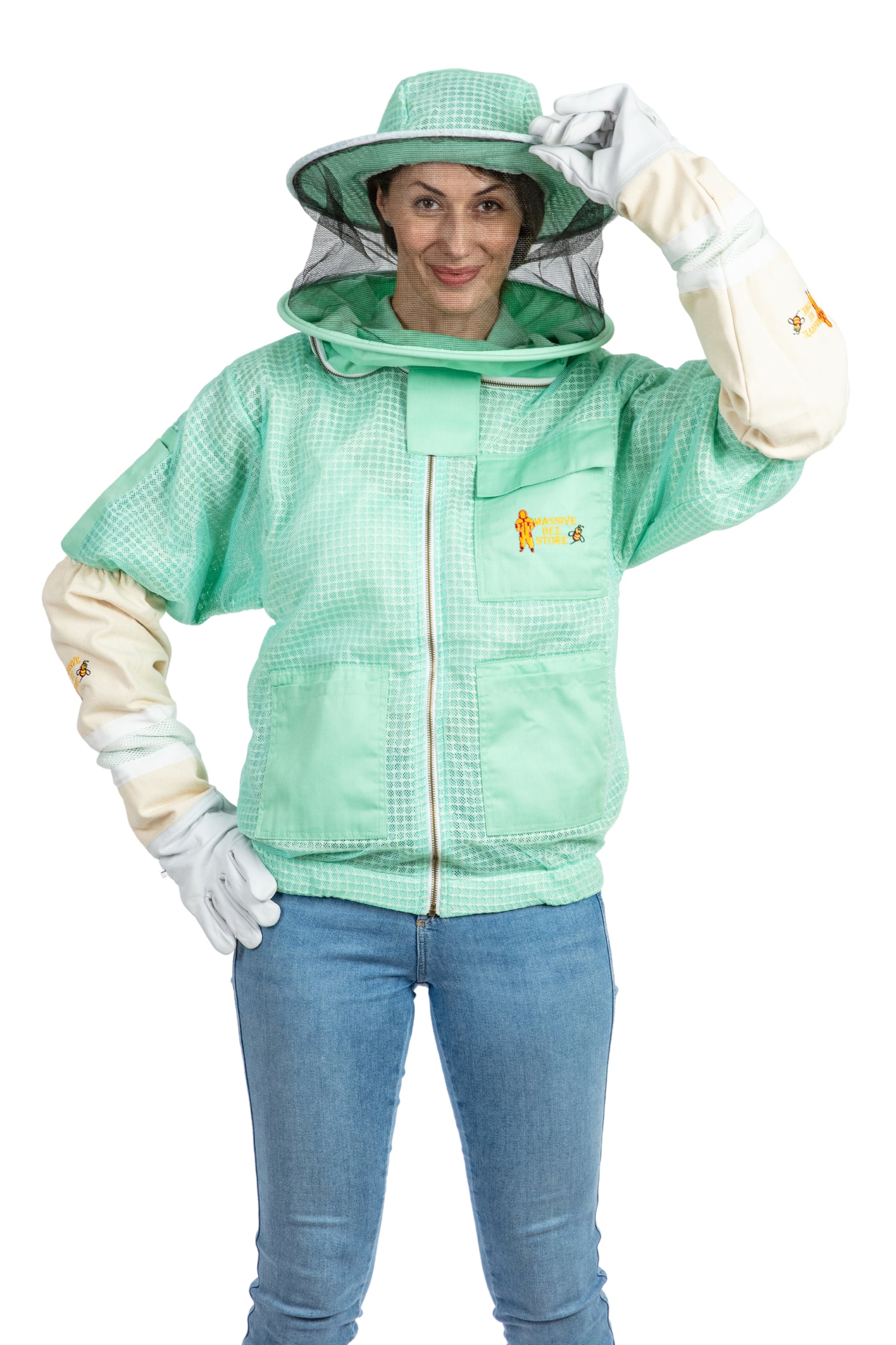 Unique protective Beekeeping Gear is made of finest high quality 3-Layers of fabric. The inner and outer Layers are made of Polyester Cotton mesh. EVA mesh fabric is sandwiched between Polyester cotton Mesh. Through this inner layer overall thickness of the beekeeping Jacket is 4 mm. The thicknesses of the Jacket keep bees well above your skin and have less chance of a successful sting. Although, the Jacket is made of permeable materials so it provides a high degree of ventilation. So, if you live in hot region where climate get very hot in the Bee season, then you really consider us.