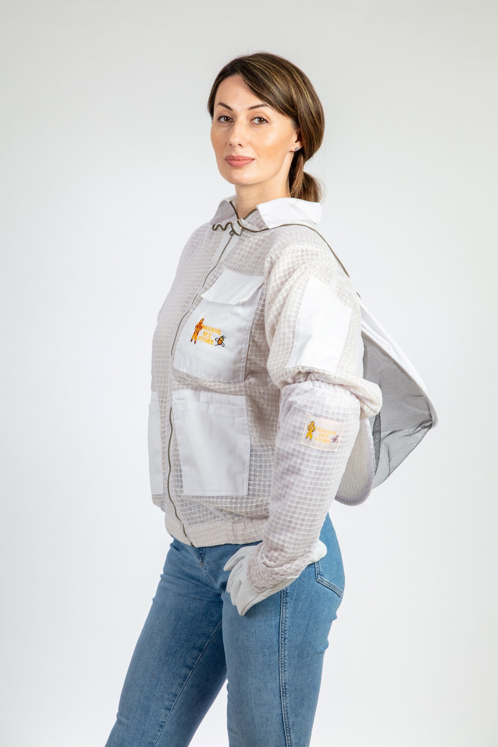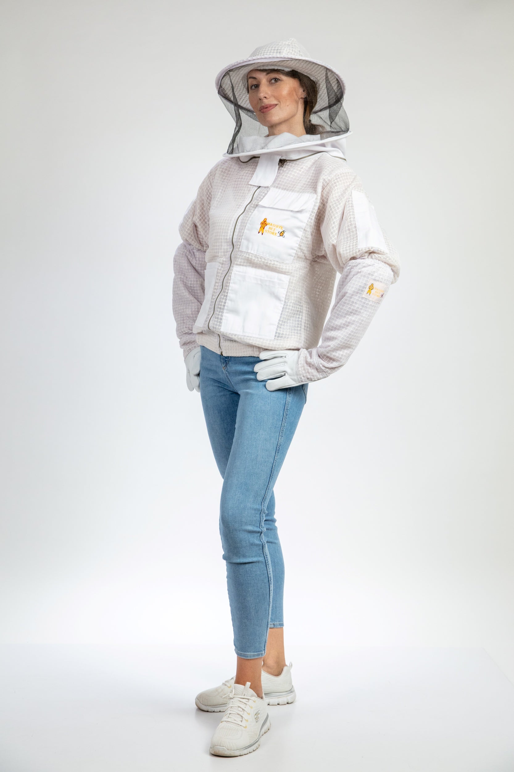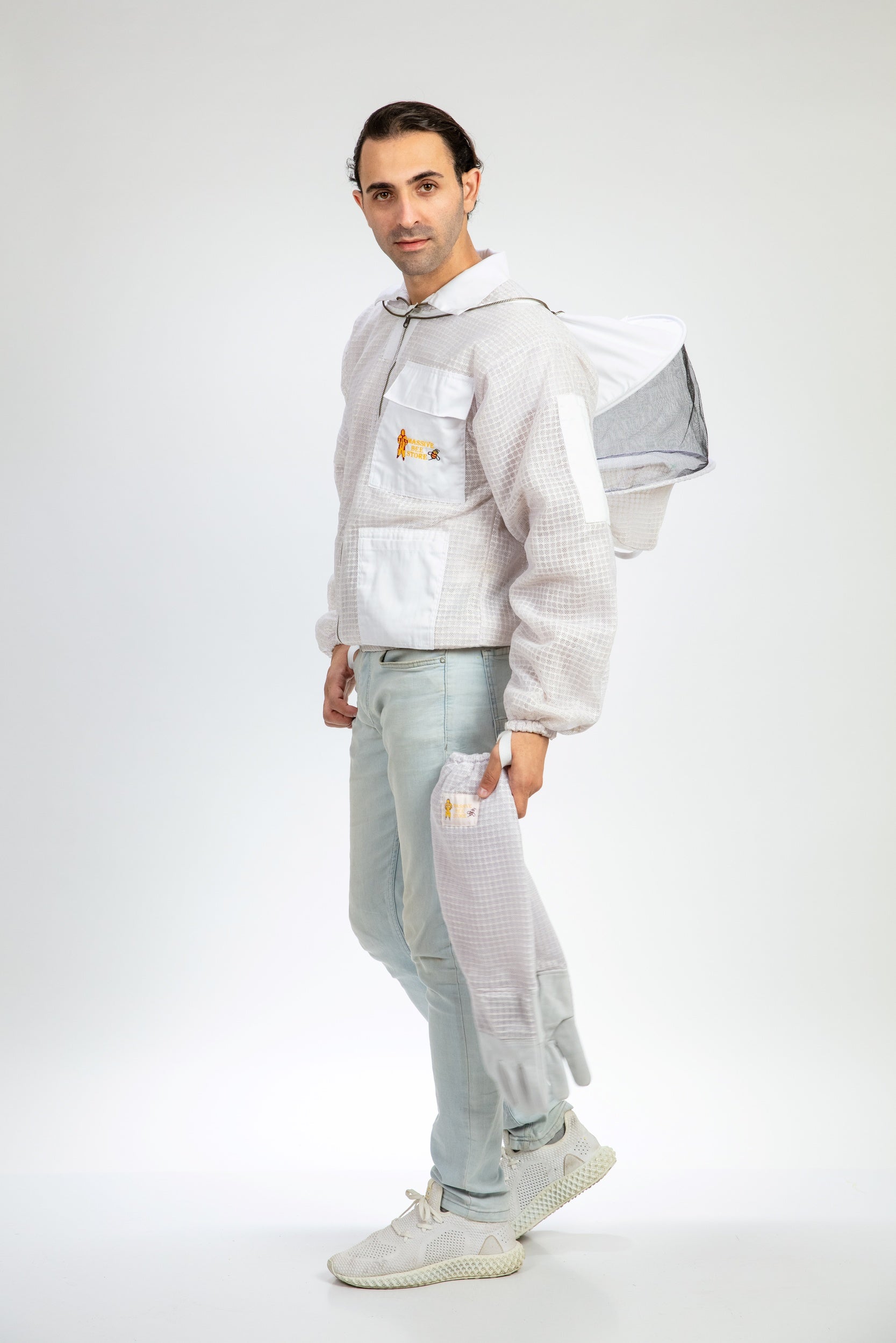 Unique protective Beekeeping Gear is made of finest high quality 3-Layers of fabric. The inner and outer Layers are made of Polyester Cotton mesh. EVA mesh fabric is sandwiched between Polyester cotton Mesh. Through this inner layer overall thickness of the beekeeping Jacket is 4 mm. The thicknesses of the Jacket keep bees well above your skin and have less chance of a successful sting. Although, the Jacket is made of permeable materials so it provides a high degree of ventilation. So, if you live in hot region where climate get very hot in the Bee season, then you really consider us.